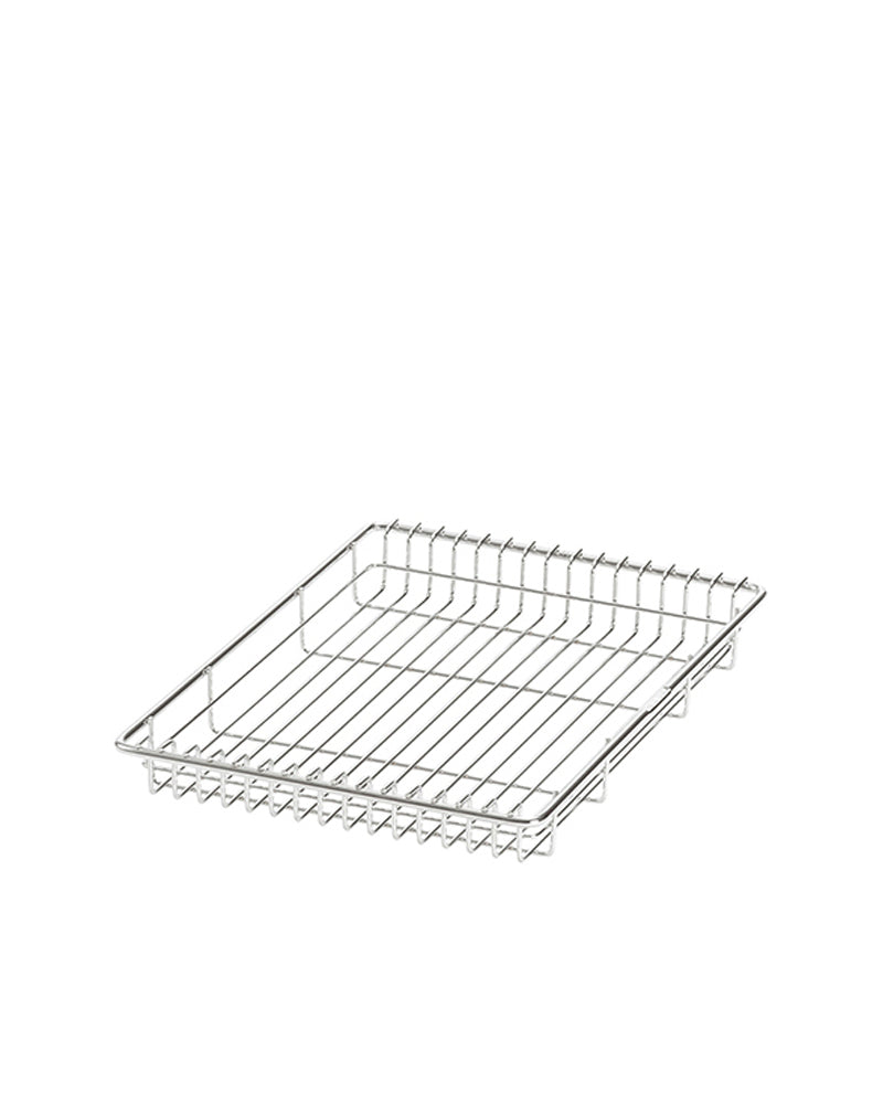 The durable, stainless steel Shallow Mesh Tray 1 Unit is designed to add extra storage to the Iron Grill Table.